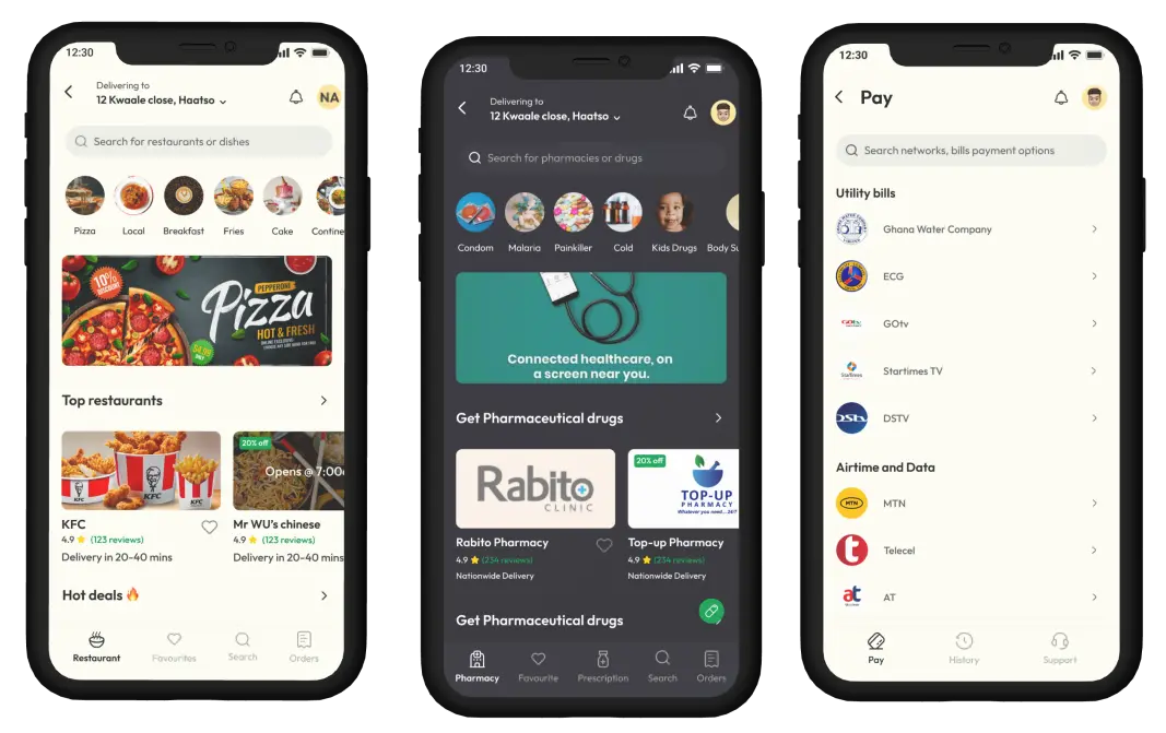 Enjoy ultimate convenience with our super app: food, pharmacy, grocery, deliveries, seamless ecg & water bill payments, and easy airtime and data top-ups—all in one place.